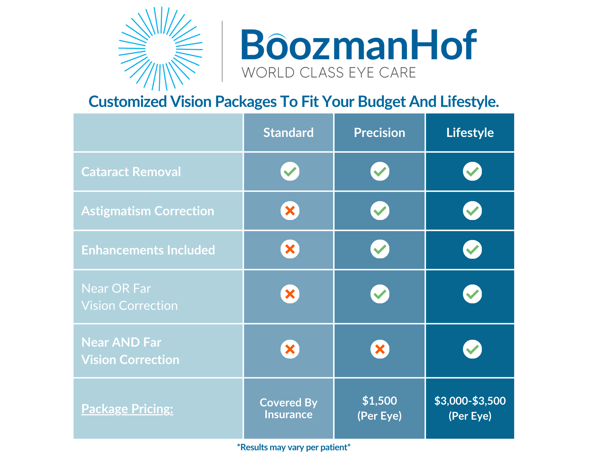 Cataract surgery involves replacing your cloudy lens with a clear, artificial intraocular lens (IOL). The type of IOL you choose can impact your vision after surgery, including how much you rely on glasses. At BoozmanHof, we offer a range of IOL options to fit different lifestyles and vision needs.